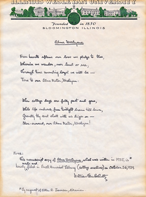 This document contains the original lyrics to the Illinois Wesleyan University school song, written by faculty member William Eben Shultz in 1935. Schultz was a faculty member from 1934-1964 and donated this manuscript copy to the archives at Buck Memorial Library in 1939.