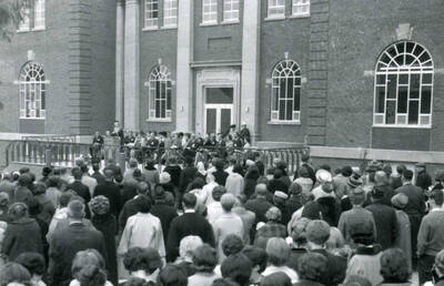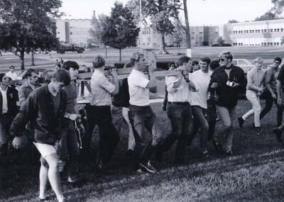 This 1969 photograph of the Illinois State University victory bell dates back to a former tradition observed by both Illinois Wesleyan and ISU. Until 1969, IWU and ISU faced off annually in football. The neighboring schools would ring their respective victory bells prior to the game. Twice in the 1960s, IWU students stole ISU's victory bell as a prank - once in 1967 and again in 1969. The photograph displayed here features IWU students bringing ISU's bell back to campus after the heist.