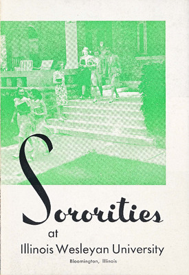 Dating approximately to the 1950s, this brochure provides a brief overview of sororities at Illinois Wesleyan University complete with photographs of the chapter houses.