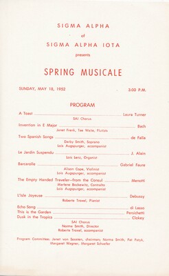 This 1952 program features the music selections and musicians for Sigma Alpha Iota's Spring Musicale.