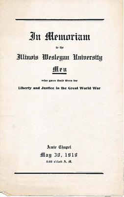 Designed for a memorial event at Illinois Wesleyan in 1919, this program lists the names of all IWU-affiliated soldiers who died during World War I.