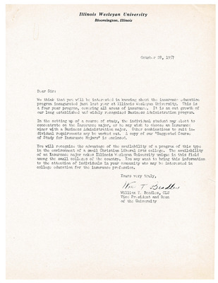 This letter from Professor William T. Beadles announces the introduction of an insurance program at Illinois Wesleyan University. The enclosure on the second page offers a look at the program's course of study.