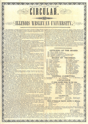 A broadside advertisement, printed early in 1851, "set forth the fact that the school is now in operation, the branches taught, terms of tuition, etc." It was probably written by the Reverend John S. Barger, perhaps the true father of the University, who was presiding elder of the Bloomington District of the Methodist Church and who had doggedly pushed the institution into being - through committees, through correspondence, through Conference, past political shoals and denominational splits. One thousand of these circulars were printed, exhorting the reader to consider the advantages of a college education at Illinois Wesleyan University.